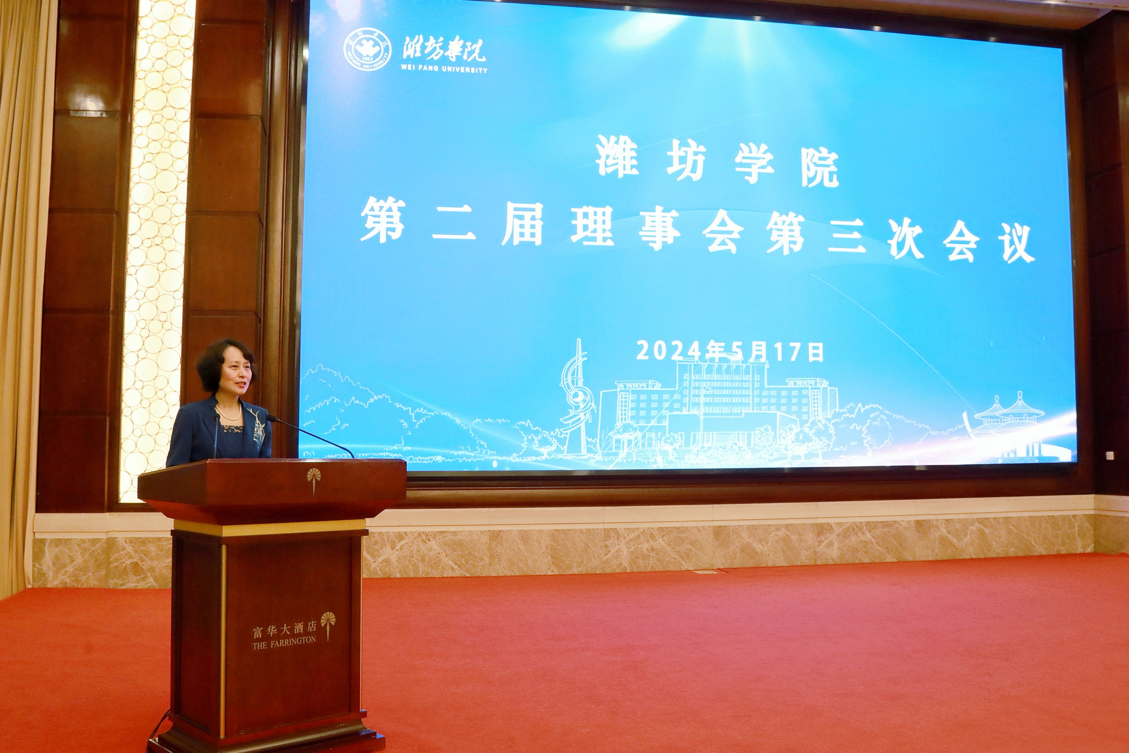 本网讯 5月17日下午,suncitygroup太阳官方网站第二届理事会第三次会议召开。学校党委书记、第二届理事会理事长徐梅出席会议并作工作报告,党委副书记王守全主持会议,党委领导班子成员王成端、李英德、苗金春、赵卫红、任立春、赵加强、张晓静出席会议,suncitygroup太阳官方网站原党委书记辛丕宏、李东,suncitygroup太阳官方网站原党委副书记、校长冯滨鲁,第二届理事会副理事长单位代表、潍坊16个县市区与开发区作为首次理事成员出席会议。