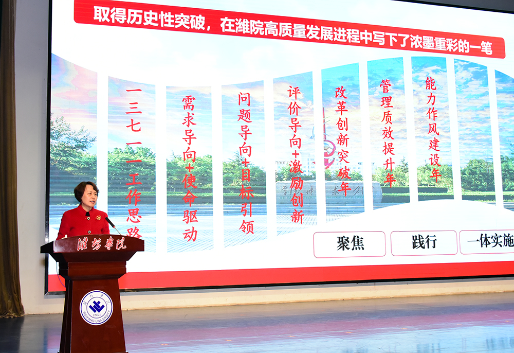 徐梅在讲话中充分肯定了学校2024年取得的成绩。她指出,全校上下蓄积开局之势、汇聚开局之力、展现开局之为,聚力内涵发展、创新发展、开放发展、突破发展,继往开来,积厚成势,教育教学、学科建设、科学研究、师资队伍建设等核心办学指标均取得历史性突破,在潍院高质量发展进程中写下了浓墨重彩的一笔。