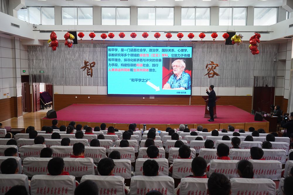 仪式上,张学祥与赵玉晗共同为“和平教育教学实践基地”揭牌。研讨会上,张学祥以“和平管窥”为题作了一场精彩的和平学讲座。他系统阐述了和平的丰富内涵,展示了中华优秀传统文化中的和平元素,梳理了基于人类命运共同体理念的中国当代和平外交实践,指出了中国在维护世界和平方面的重要作用,号召与会者共建和平,珍爱和平,守护和平,引发积极反响。
