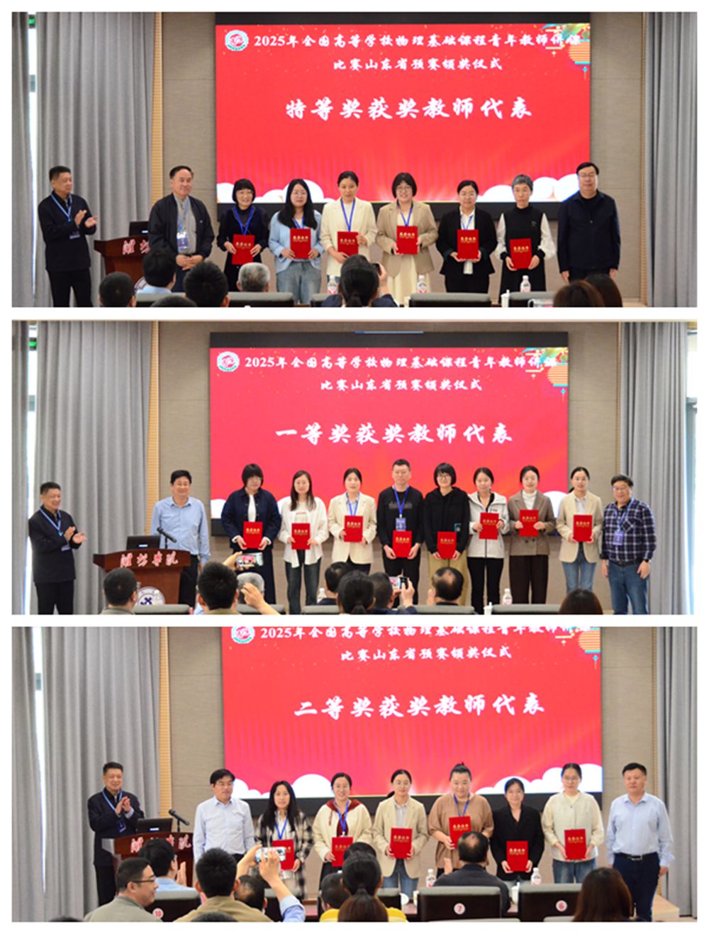 本网讯 4月26日至27日,“2025年全国高等学校物理基础课程青年教师讲课比赛山东省预赛暨山东省第六届青年教师物理教学工作坊”在太阳官网举行。学校党委委员、副校长王成端出席颁奖仪式并致辞。全国优秀教师、全国物理青年教师讲课比赛一等奖获得者、全国教育硕士优秀指导教师等多位知名专家受邀担任评委。