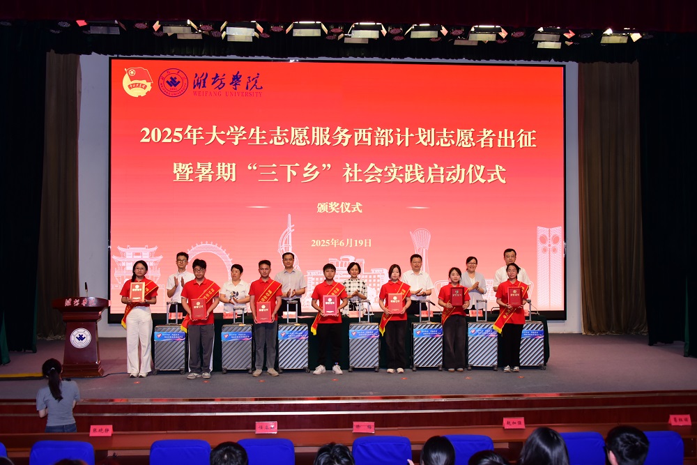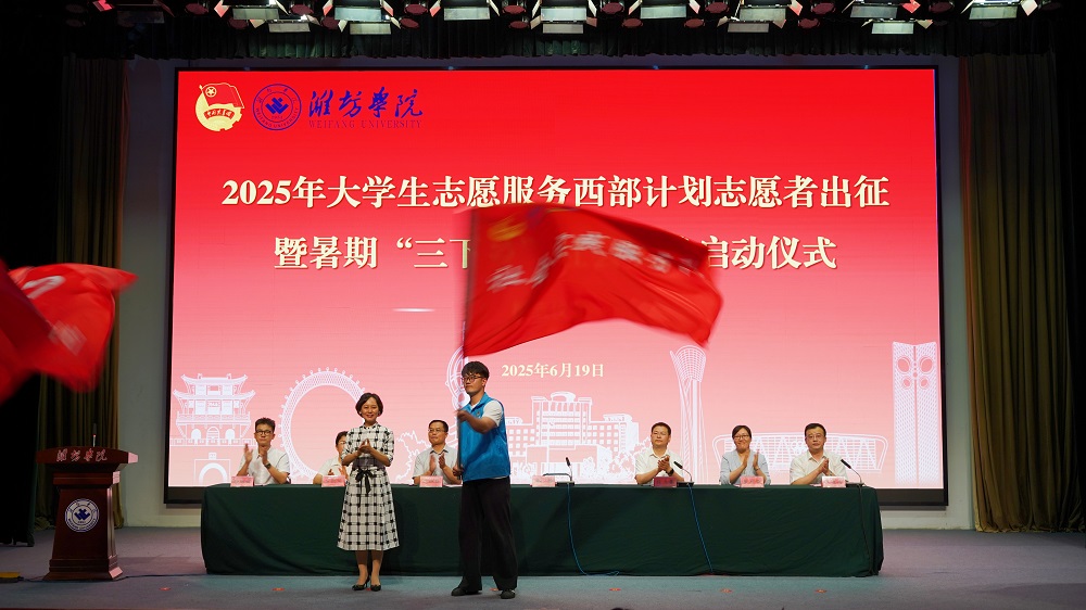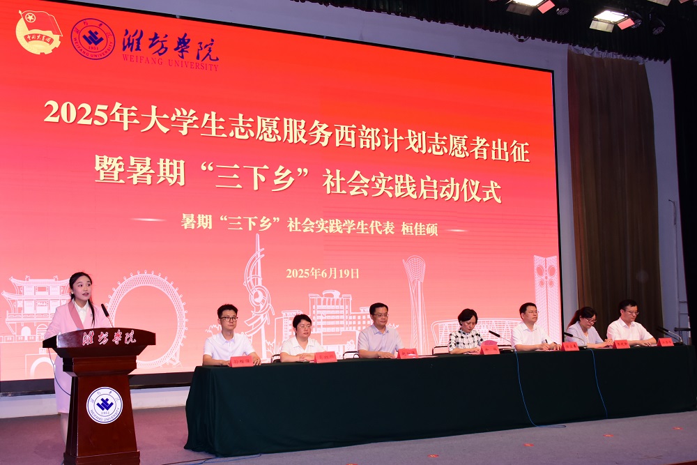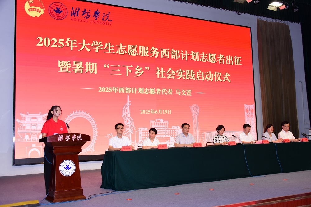 徐梅代表学校对入选2025年西部计划的165名志愿者表示祝贺。她指出,习近平总书记给谢依特小学戍边支教西部计划志愿者服务队队员回信,勉励广大青年到祖国和人民最需要的地方发光发热,为新时代青年成长成才指明了前进方向。希望全体志愿者牢记习近平总书记的殷切嘱托,坚持与“土地”对话,以青春足迹丈量基层经纬;与“自己”对话,以实践锤炼厚植青春底色;与“未来”对话,以潍院温度续写西部新章。